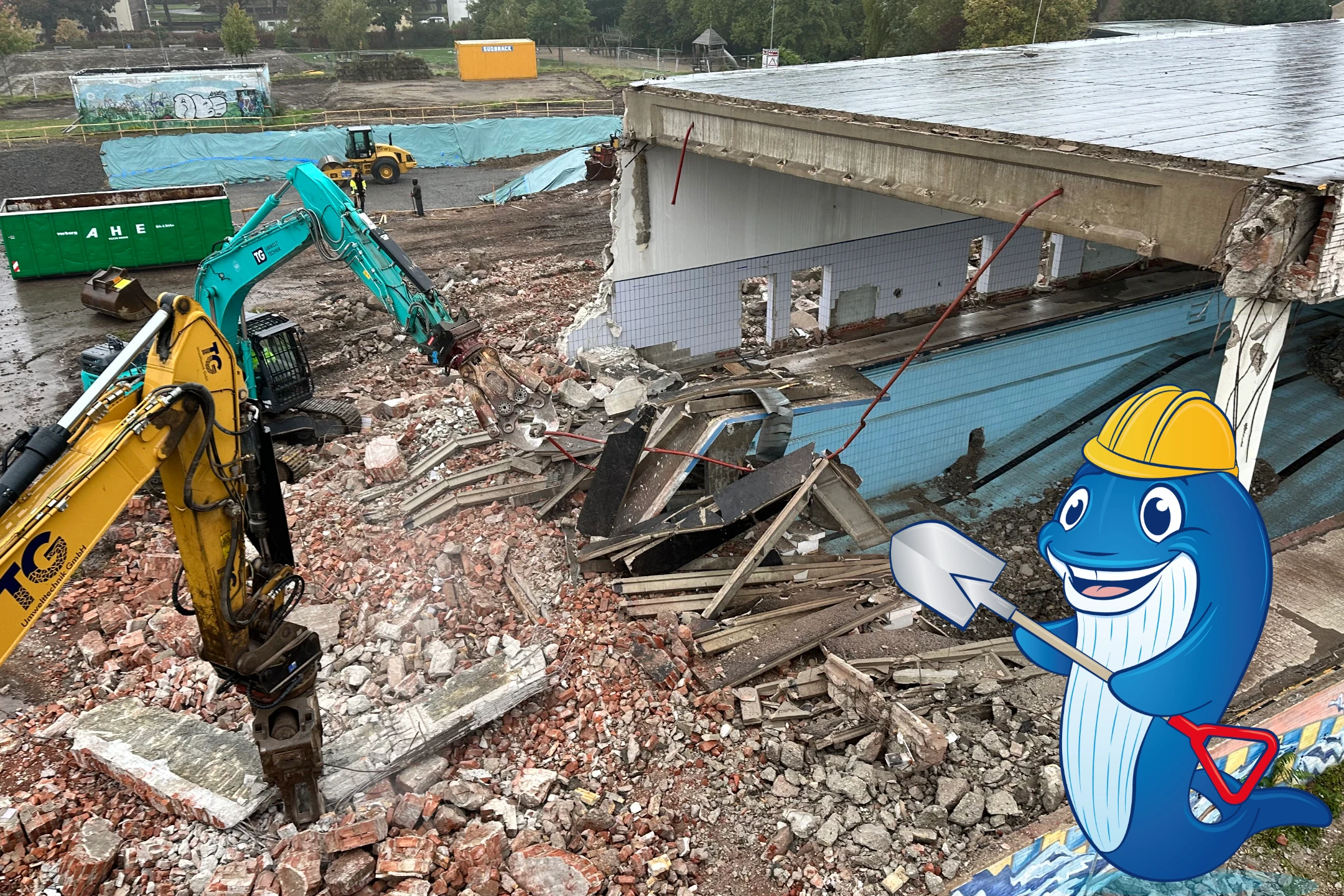 Seit der Abschlussparty hat sich viel getan:Fachfirmen haben das alte Hallenbad entkernt und für den großen Abriss vorbereitet. Nun ist es soweit und die zwei großen Abrissbagger sind vor Ort.In den nächsten Tagen und Wochen werden auch die restlichen Mauern, das Dach, dasSchwimmbecken und der Keller mit Hilfe der Bagger verschwinden. Im Hintergrund seht ihr, dass die alte Turnhallte schon lange verschwunden ist. Bald ist das Gelände bereit für den Neubau, der an der gleichen Stelle in den kommenden zwei Jahren entstehen wird.
